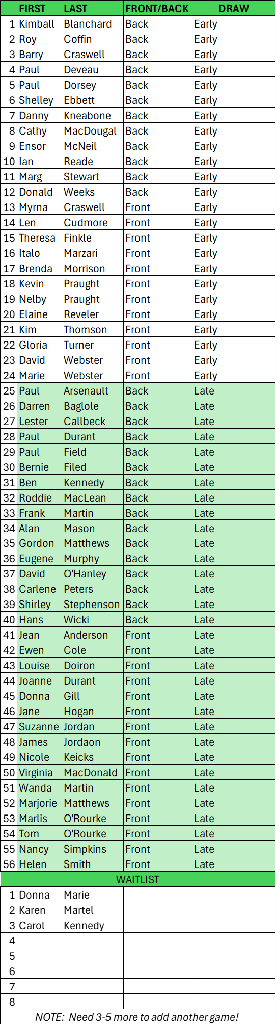 NOTE: We currently have three curlers on the waitlist – we need a minimum of three more curlers, preferably five more to add another game to the early draw! If you would like to join us please let me know ASAP! If you intended to sign up and don’t see your name, please let me know as well.