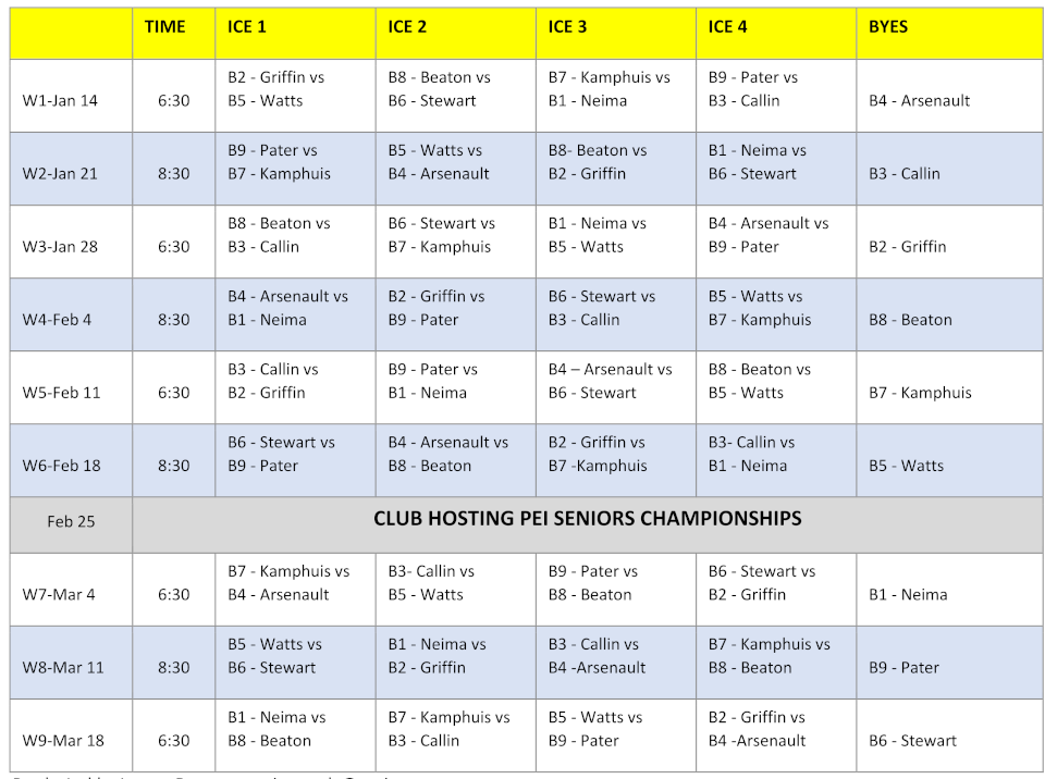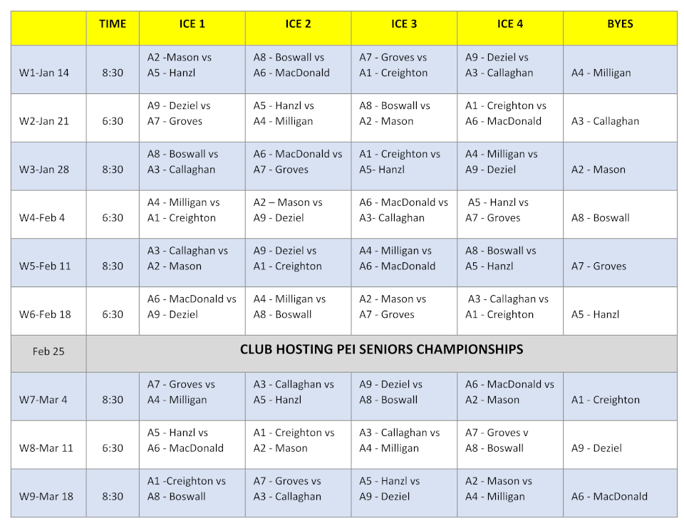 Curling times for your team will alternate between 6:30pm and 8:30pm throughout the season, and can change at the end of each round, depending on which pool you end up in for the next round.