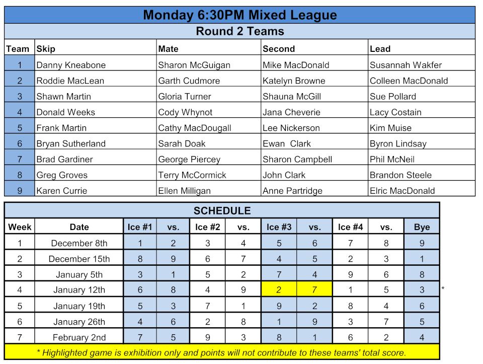 This draw is a single-entry mixed league with a 6:30pm start time.