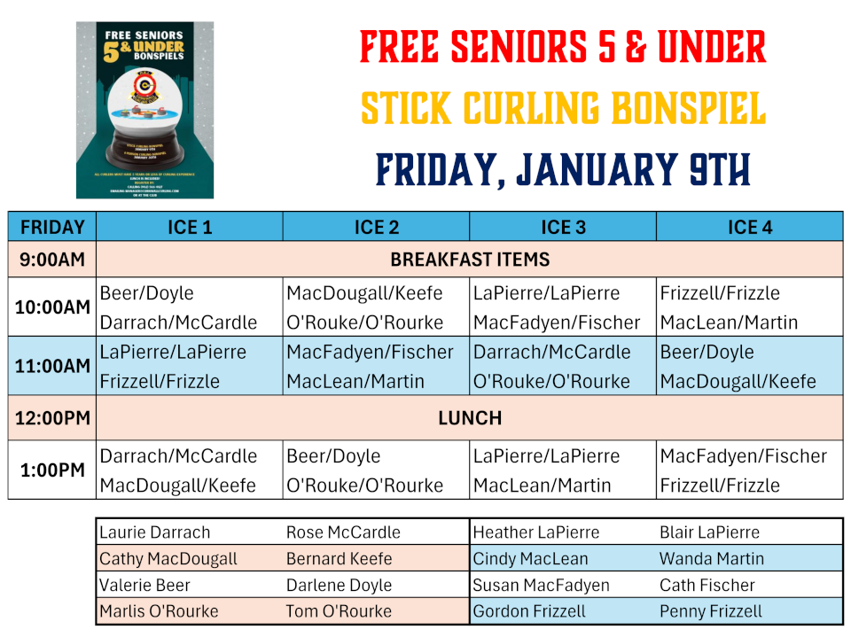 Thanks to a New Horizons Grant, the Cornwall Curling Club Daytime Committee is pleased to be hosting our FREE 5 & Under Seniors Stick Curling Bonspiel this Friday, January 9th.